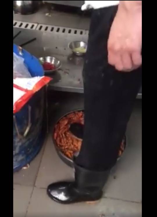 【中国】汚い長靴で食材を踏んで調理するシェフ
