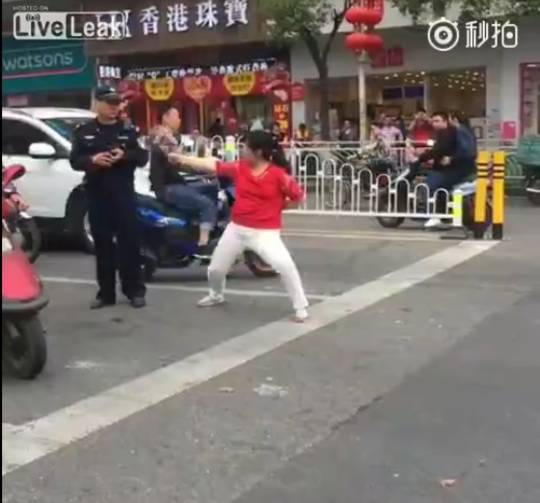 2017年2月24日、中国・広東省・増城市にて、路上で交通の妨げになっている女がいると通報を受け駆け付けた警察官に対し、挑発してマ〇コを見せる女が逮捕された。