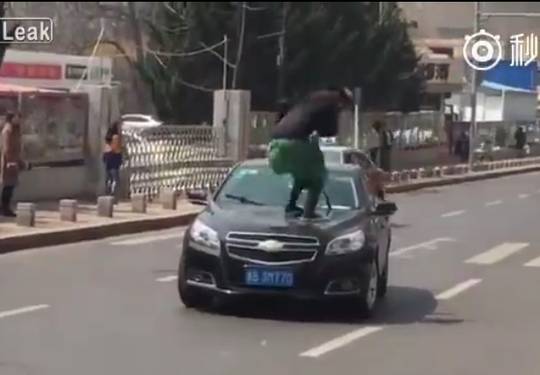 通行料を支払わないという車には、ボンネットの上に乗ってジャンプし、ドアを蹴りまくるクレイジーな女が激写される。