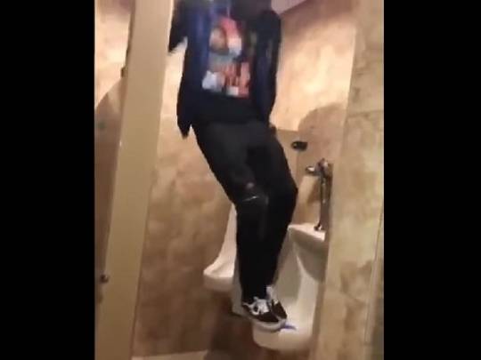 店のトイレで酔っているらしい男性が小便器に上がり壊そうとするも・・・