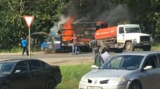 ロシアでは2018年7月に、トラック荷台が燃えた火災で通り掛かったバキュームカーが消火した事があり、動画も出回って話題になったため、