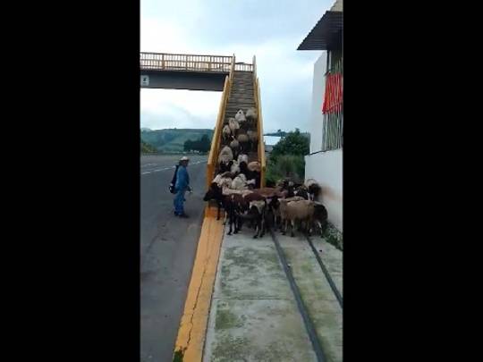 Farmer uses a pedestrian walkway to have his herd to cross the street safely