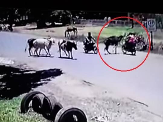 農村地区の道路を車やバイクが往来しているのも余り気に留めず横切ろうとする数頭の牛達、だがその内の1頭の牛が通り掛かったバイクの女性にいきなり・・・