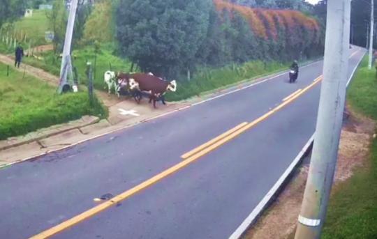 コロンビア中部のセスキレで2025年12月31日、道路上を走行していたオートバイと、逃げ出した牛が衝突する事故が発生した。
