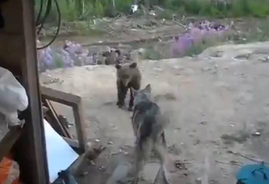 犬 vs 子熊 そこへ親熊が現れるΣ(゚д゚lll)