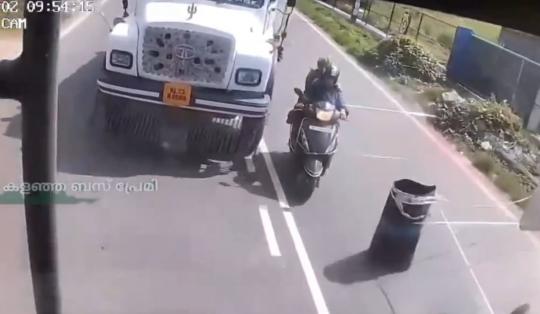 インドで、2人乗りのバイクが走行中のトラックと衝突し、運転していた男性が車体の下敷きになる事故が発生した。