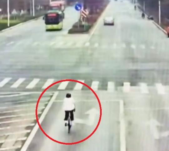 中国で、車道を走行していた自転車が交差点に進入し、トラックと衝突する事故が発生した。事故は市街地の交差点で起きた。