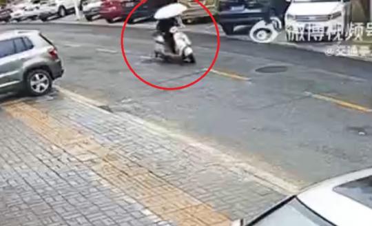 中国で4月20日、傘を差しながらスクーターを運転していた男性が逆走中に転倒し、対向車と衝突する事故が発生した。