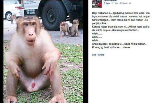 【動物虐待】マレーシア 爆竹によって指が吹き飛ばされた猿の写真がFacebookに投稿され非難殺到