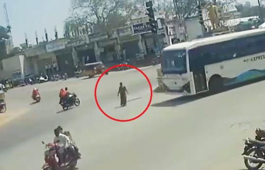 インド・テランガーナ州ナラゴンダのバスタンド付近で、道路を横断していた女性が州営バスに轢かれ死亡する事故が発生した。事故の様子は現場の防犯カメラに記録されていた。
